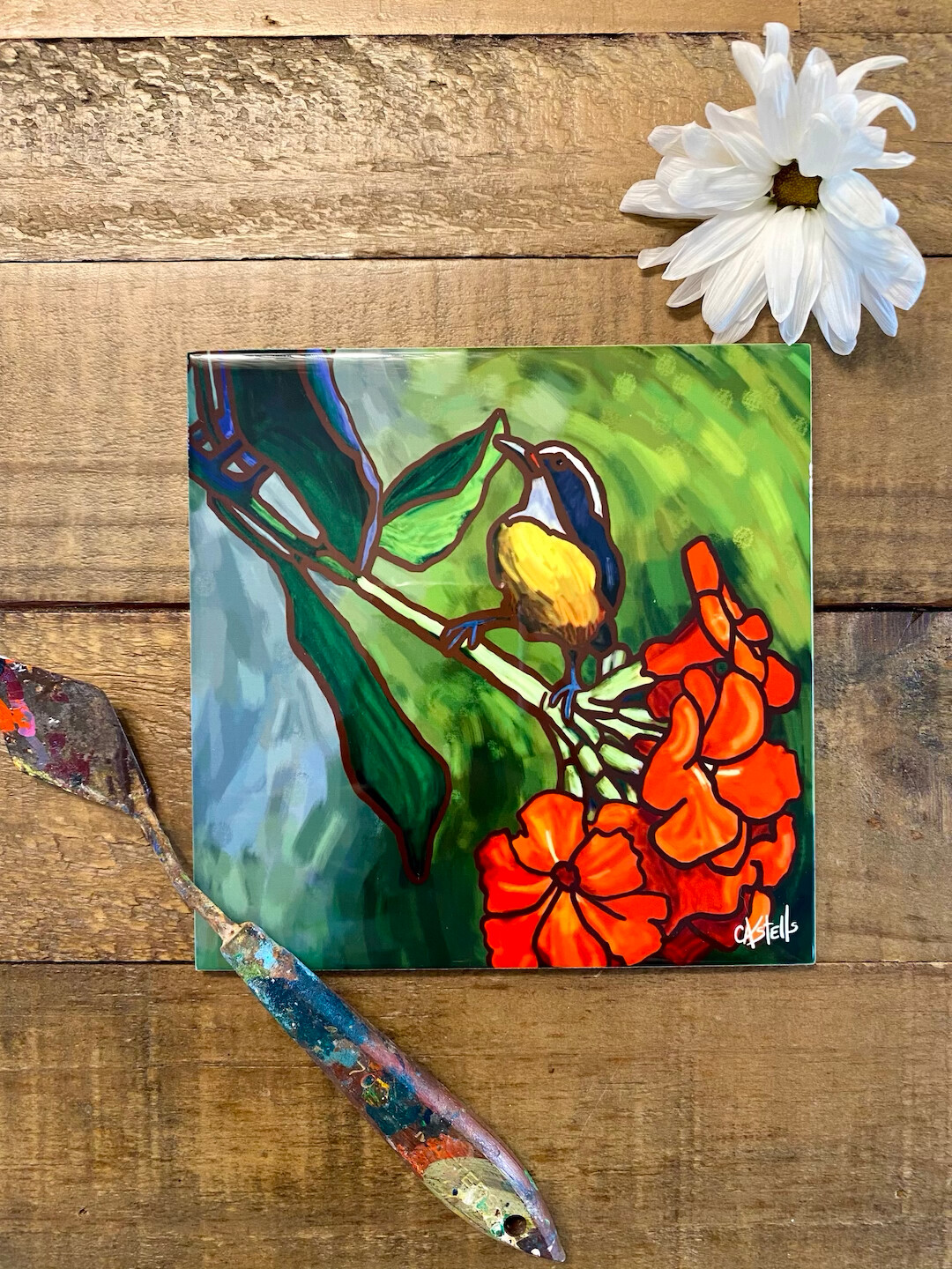 This high quality 6" × 6" tile comes with a hanger ready to mount on wall. Created from an original painting by the award-winning artist.